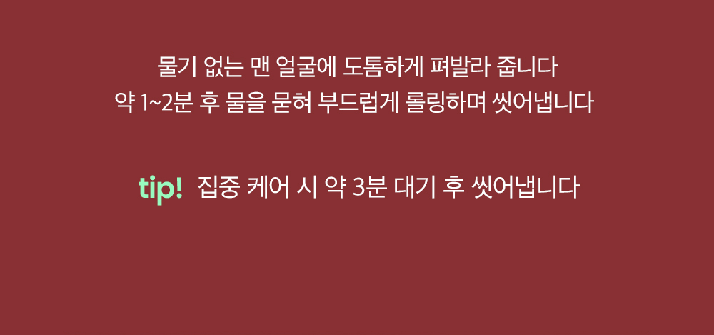 »ç¿ë¹æ¹ý [¿ö½Ã¿ÀÇÁ ÆÑ] ¹°±â ¾ø´Â ¸Ç ¾ó±¼¿¡ ÃæºÐÇÑ ¾çÀ» µµÅèÇÏ°Ô Æì¹ß¶ó ÁÝ´Ï´Ù. ¾à 1~2ºÐ ÈÄ ¹°À» ¹¯Çô ºÎµå·´°Ô ·Ñ¸µÇÏ¸ç ±ú²ýÇÏ°Ô ¾Ä¾î³À´Ï´Ù. [Ŭ·»Â¡ Æû] Àû´ç·®À» ¼Õ¿¡ ´ú¾î ¹°°ú ÇÔ²² °ÅǰÀ» ³» ÇǺθ¦ ºÎµå·´°Ô ¸¶»çÁöÇØÁÖ°í, ¹Ì¿Â¼ö·Î ±ú²ýÀÌ ¾Ä¾î³À´Ï´Ù. [TIP] ½ºÆÄÃô¶ó·Î ³»¿ë¹°À» Æì ¹Ù¸¥ µÚ ºÀ ŸÀÔ ¹Ì´Ï °ý»ç·Î ±¹¼Ò ºÎÀ§ ¸¶»çÁö ÈÄ ¼¼¾ÈÇØÁÖ¸é º×±âÄɾ ´õ È¿°úÀûÀÔ´Ï´Ù.